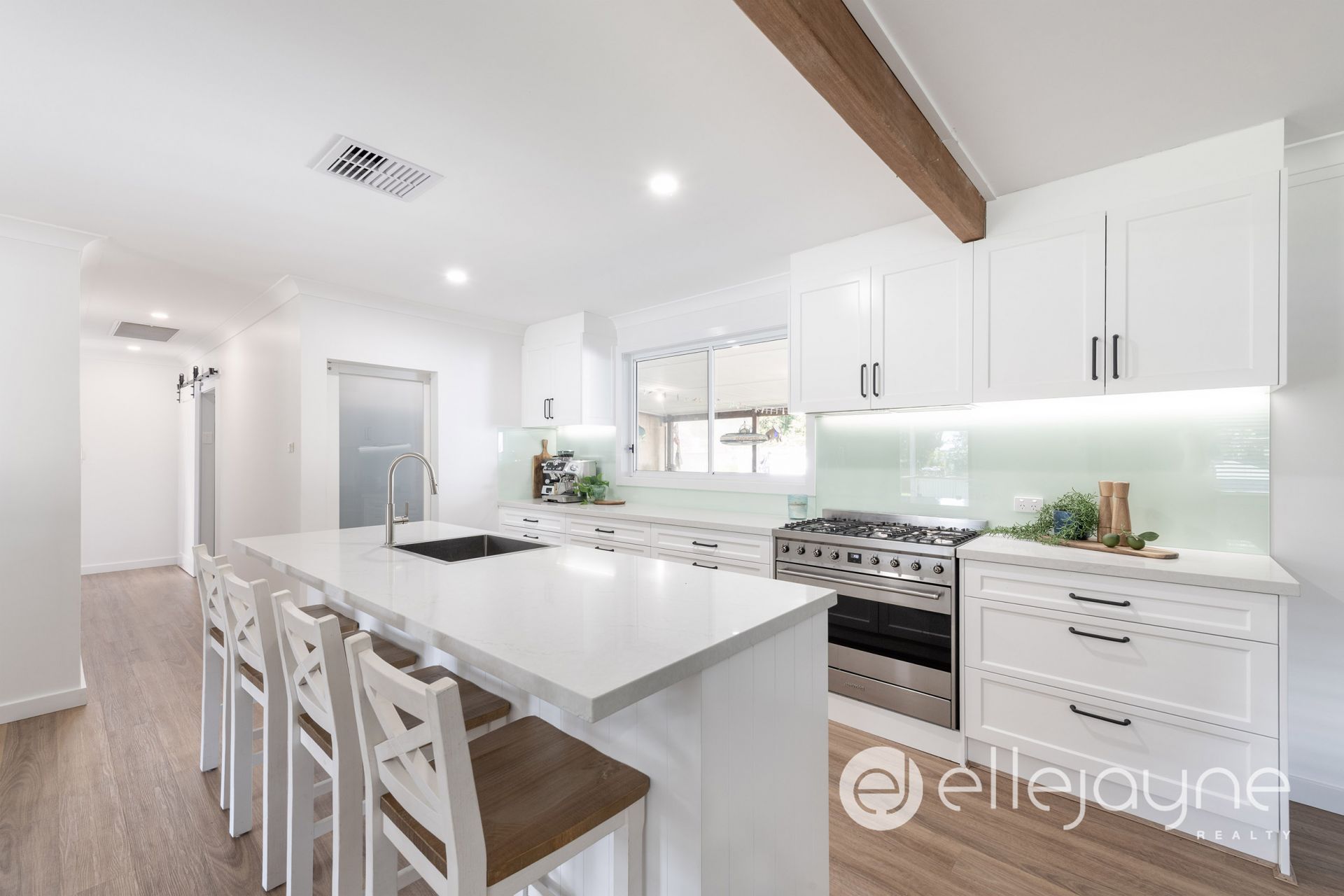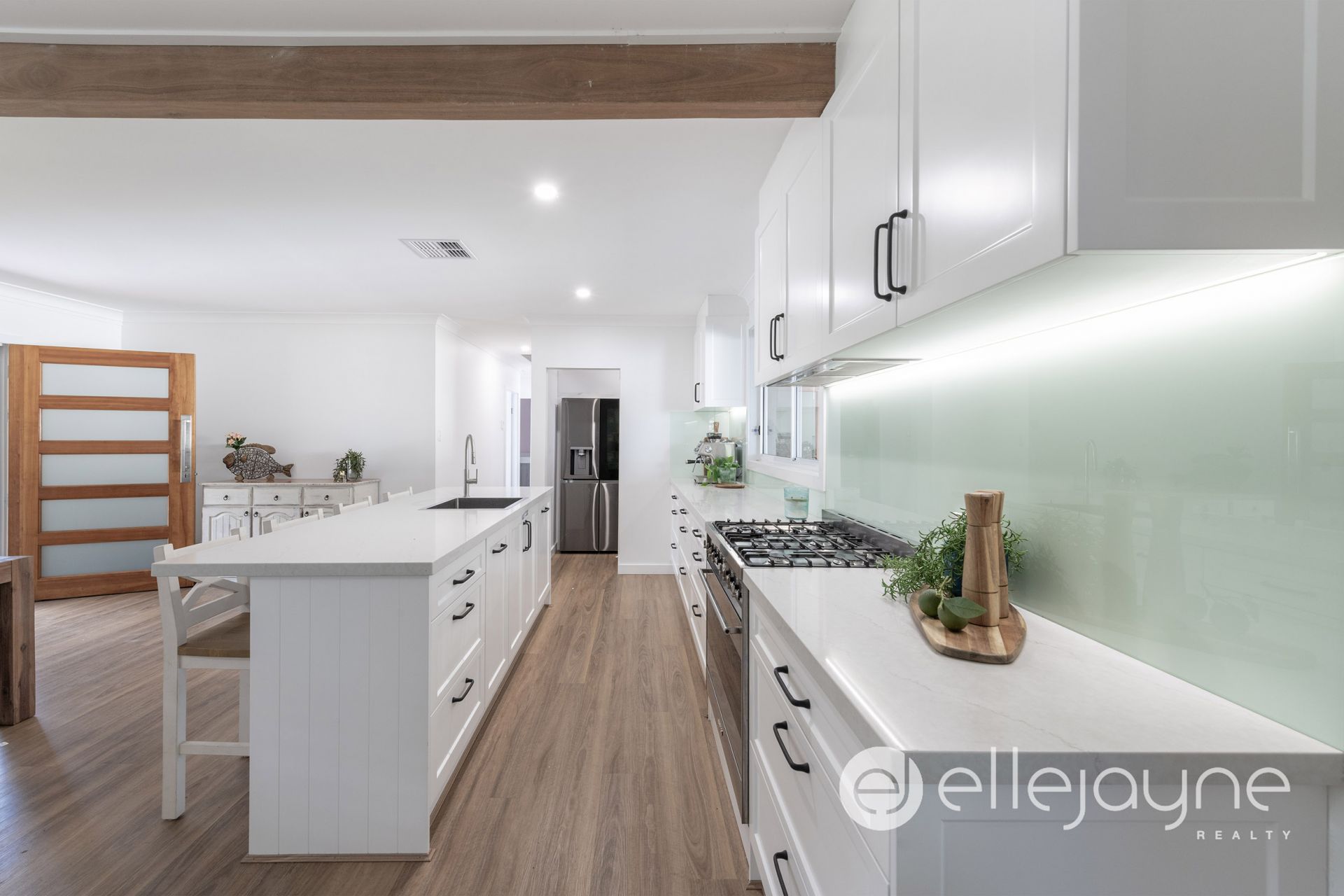 • Modern kitchen with ample storage, stainless steel appliances, rangehood, and a huge pantry