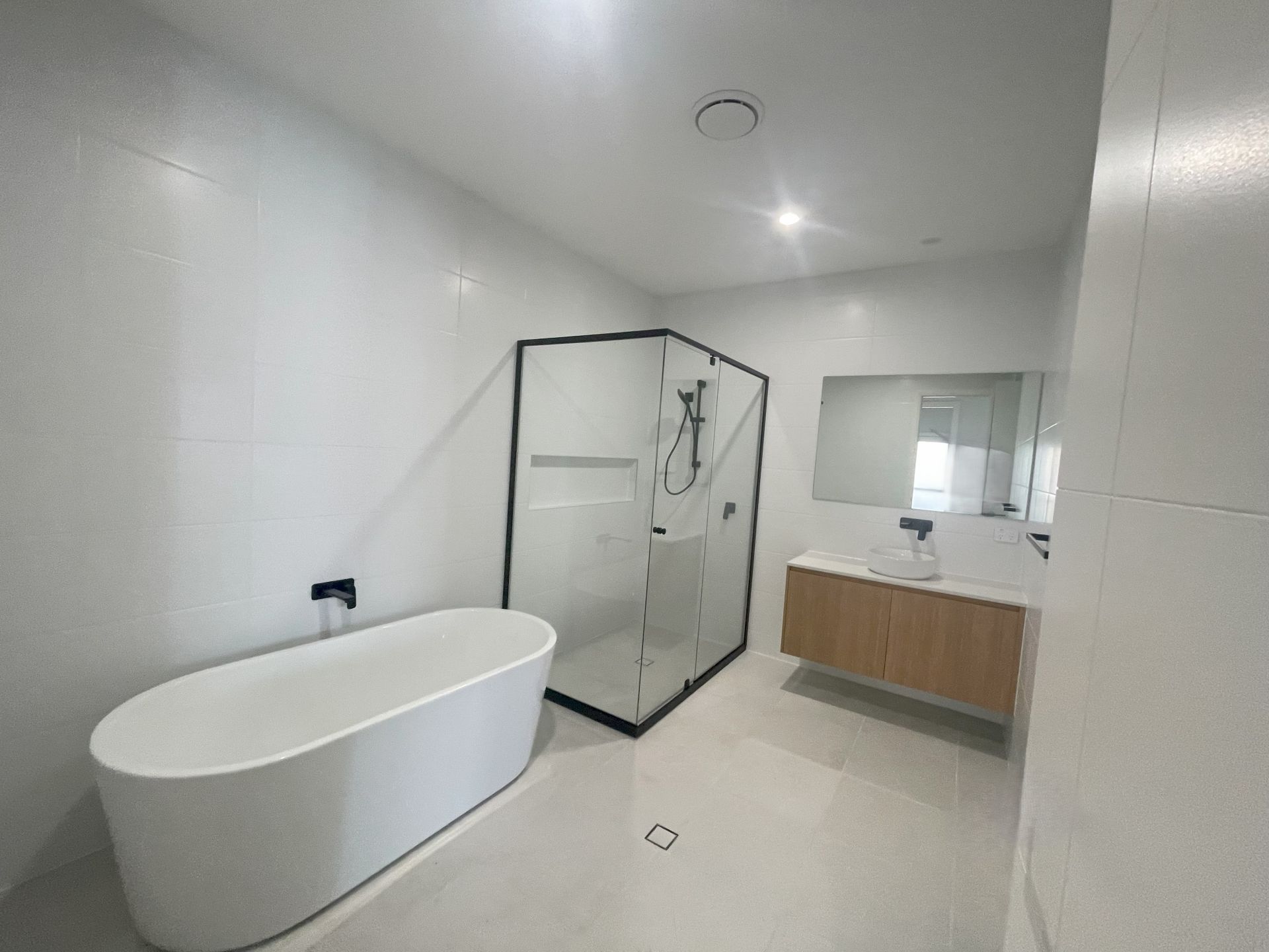 - Modern bathroom with shower, vanity and bath with separate toilet