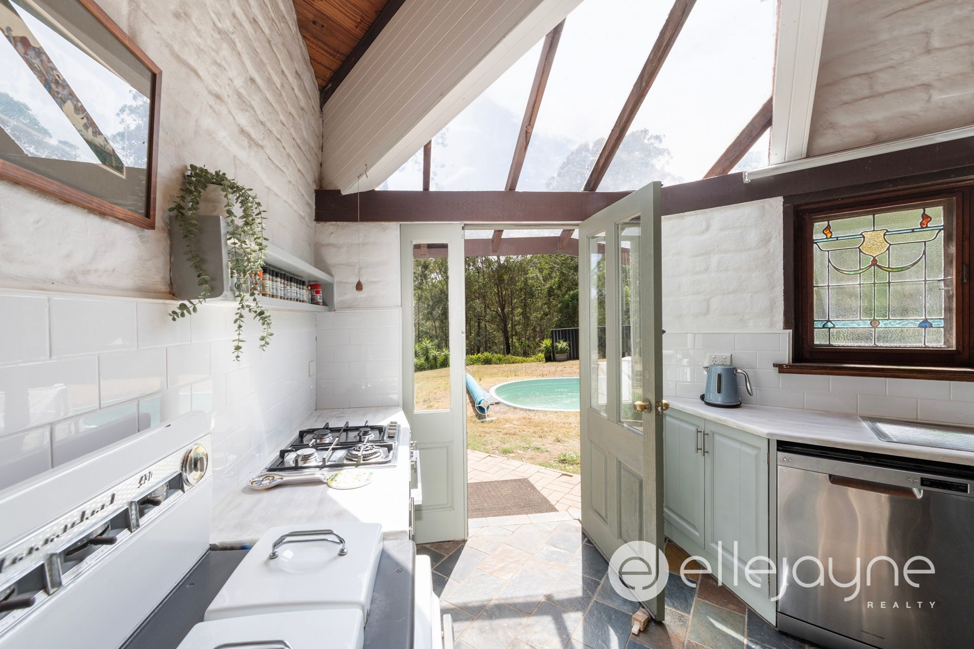 • Charming country-style kitchen with the practicality of a walk-in pantry/wine cellar, dishwasher, significant bench space with lime washed timber benchtops, vintage-style ‘Carmichael’ cooker being nicely complimented by outstanding natural light, raked ceilings with exposed timber beams and a rural outlook over the swimming pool.