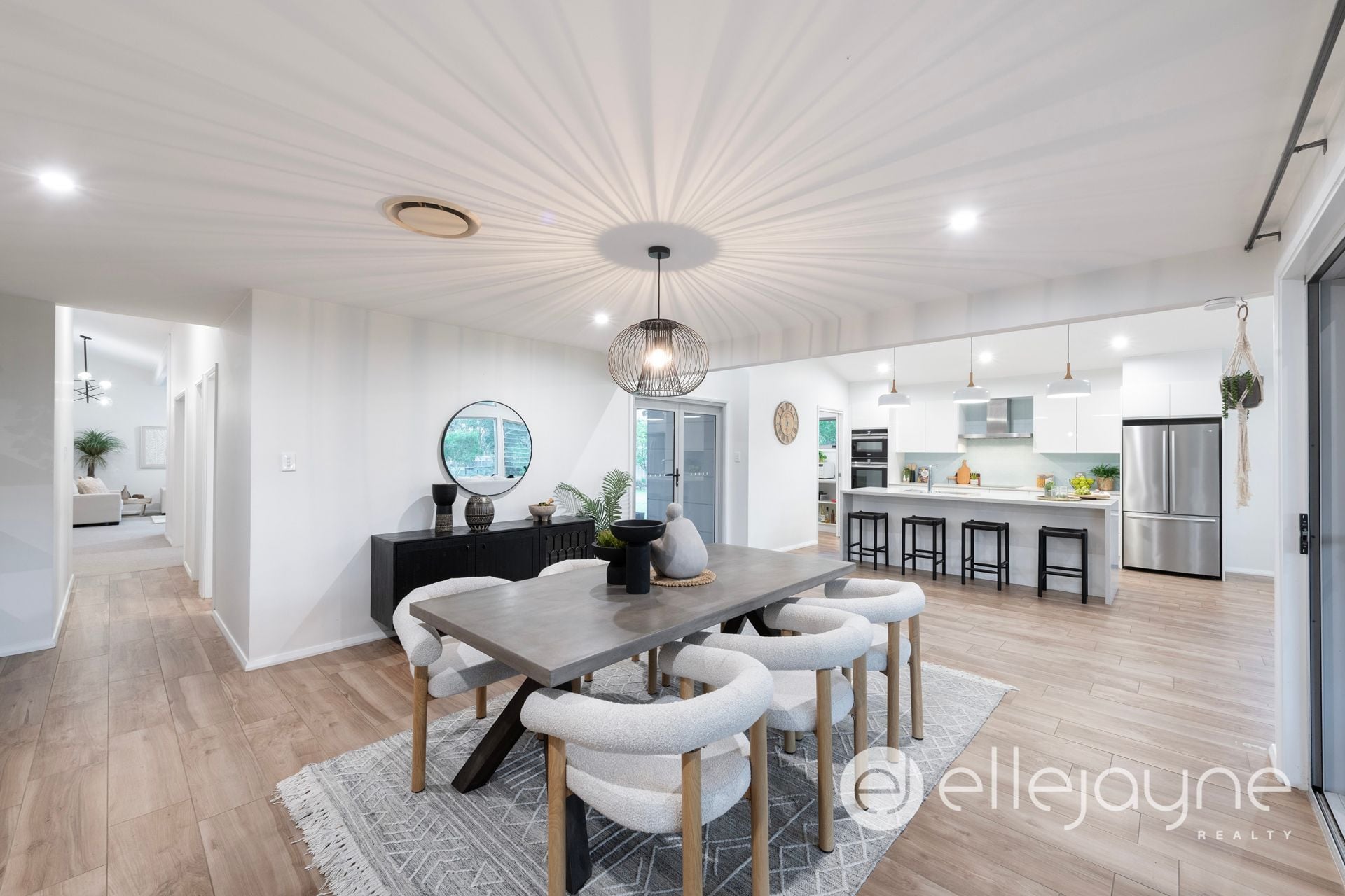 Positioned at the heart of the home, the beautifully appointed kitchen showcases Caesarstone benchtops, a generous butler’s pantry, and an effortless connection to the living and dining domains. Expansive stacker doors extend the interiors to the covered alfresco area, creating a superb indoor–outdoor flow ideal for entertaining.